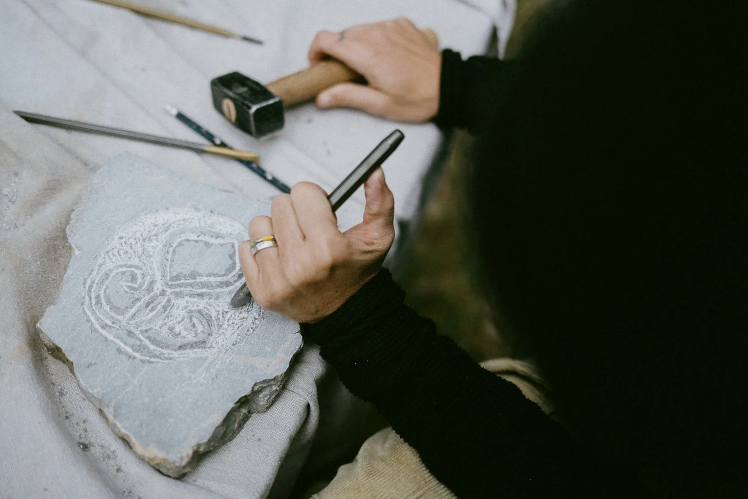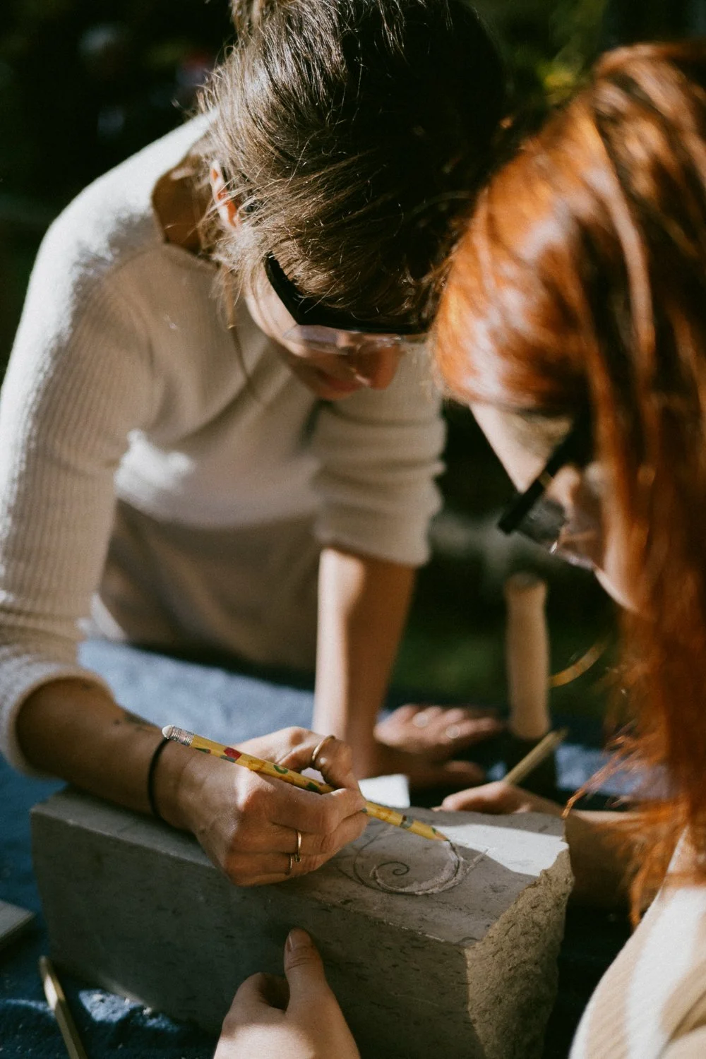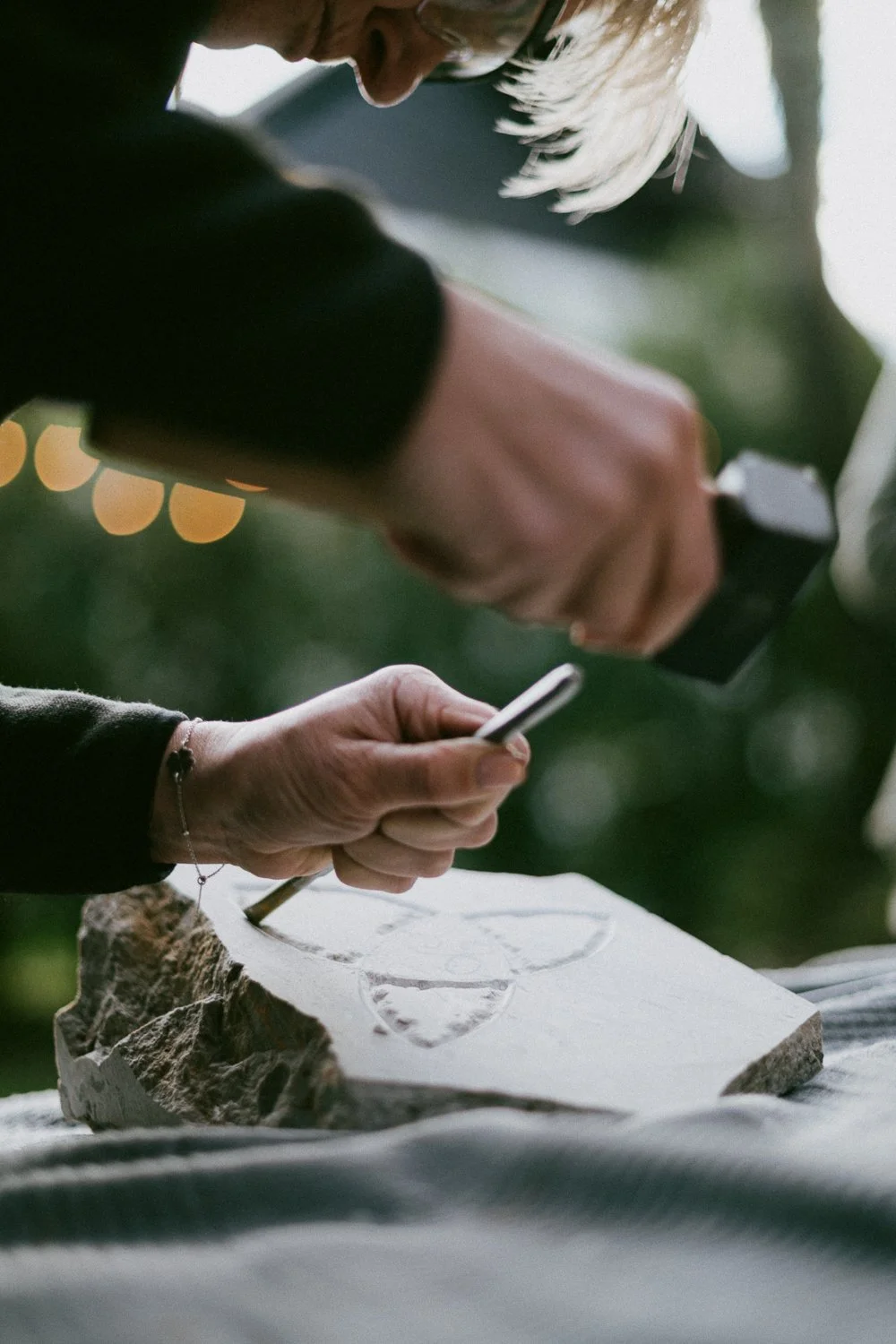 Delavnica, ki je potekala na vrtu Hotela Kristal, se je začela v soboto dopoldne, ko so se udeleženci odpravili na sprehod do potoka, ker so opravili kratko meditacijo in se pogovarjali o tem, kateri simboli so jim v tem trenutki najbližje. Veliko je bilo zgodb, zakaj so se udeležili delavnice. Prišla je ženska, sveže po ločitvi, in zase (z vsemi odlomljenimi koščki kamna) izklesala testament moči in vztrajnosti. In druga, ki je zase izklesala simbol rodovitnosti. Prišla sta mož in žena in skupaj izklesala kamen z namero ljubezni in spoštovanja. Bila je ženska, ki je izgubila svojega domačega ljubljenčka in je čutila, da si želi na kamnu nekaj podobnega odtisu tačke. Namera je bila podpora v času izgube.